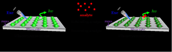 In this paper, it is mentioned that the synthesized SiO2@MIPs forms a microsensor array on the regular dot array of etched silicon wafers by self-assembled technique, and four heavy metal ions, whose LOD concentration is 10?9 mol·L?1, enter the nanostructured shell-layer with fluorescence-tagged recognition site driven by concentration differences. The recognition sites have highly selective recognition of heavy metal ions with sensitive responses. Based on FRET principle, ultra-trace detection of the target analytes can be achieved, which solves the problem of identification and detection of polymetallic ions.