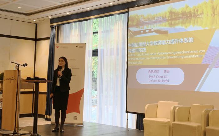 在接下來的主旨演講中,各位專家圍繞會議主題做了詳細的報告介紹。下薩克森州科學與文化部應用科學大學與職業學院司司長克拉默指出,德國應用型高校教職人員的升職路徑不夠明確,吸引人才時常常面臨來自綜合型大學的競爭挑戰。她認為,未來可嘗試采用非固定教職形式,從工商業界或其他綜合型大學有限期地招募人才,以靈活的形式帶領教研團隊。安徽省委教育工委副書記慶承松提出,應用型高校應該明確對接當地經濟社會發展的現實需要、特別是區域重大發展戰略。他建議制定相關認定標準,發揮職稱評定作用,強化教師的實踐能力培養和師資隊伍的國際化建設。奧斯納布呂克應用科學大學前副校長埃格斯教授認為,很多出色的企業人士對進入校園執教的可能性和相關路徑缺乏了解,應用型高校應該聯合起來擴大宣傳推廣。她希望地方政府能在政策上更加靈活,讓德國應用型教育吸納更多人才。我校副校長陳秀教授從中國應用型大學的發展狀況、核心特征、應用型大學教師能力體系構建以及合肥學院應用型教師能力提升的實踐等四個方面展開了對中國應用型大學教師能力提升體系構建與實踐的探討,認為應用型大學教師的能力提升體系包括能力認知、環境營造、培養途徑和能力認證幾個方面,需著力提升教師的教學能力和產學研合作能力。