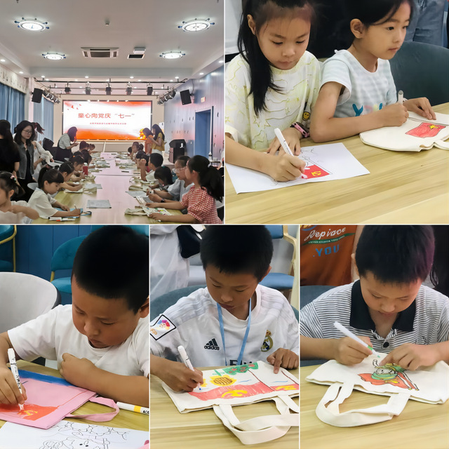 最后一個環(huán)節(jié)是手工繪制帆布袋,通過紅色故事和紅色歌曲,小朋友可以在帆布袋上繪制他們想象的畫面,學(xué)生黨員積極協(xié)助小朋友完成紅色主題的繪畫,鮮艷的黨旗飄揚在一幅幅帆布袋上。活動最后,支部黨員與小朋友們一起合影留念。